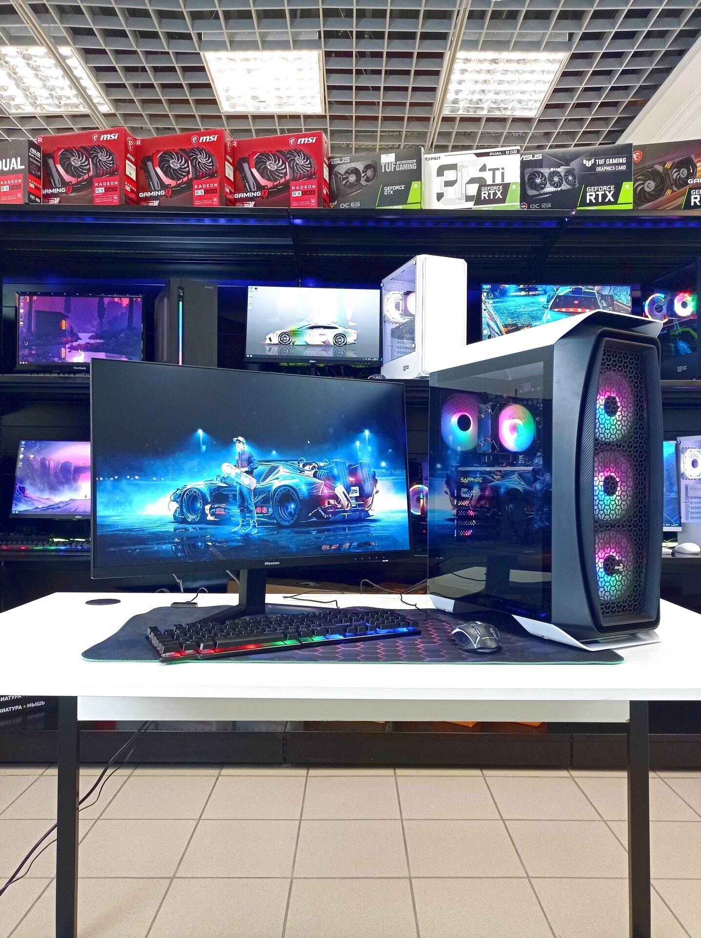 В комплекте с компьютером идут клавиатура, мышь, колонки и Wi-Fi адаптер, что позволяет сразу начать пользоваться компьютером без дополнительных затрат на периферию.